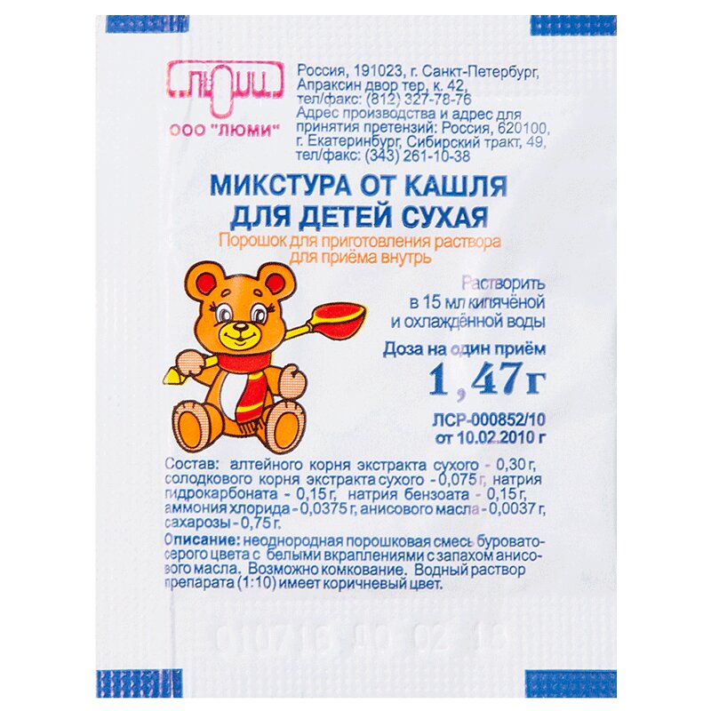 Инструкция по применению Микстура от кашля для детей сухая пор д/оралн р-ра 1.47 г пак N1