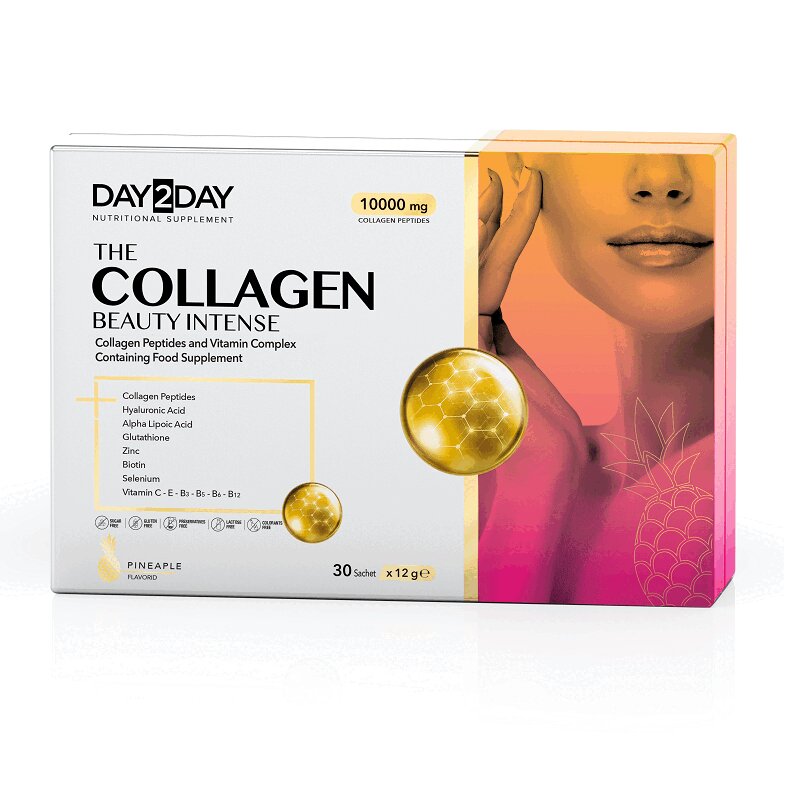 Day2Day The Collagen Beauty Plus содержит гидролизат коллагена I типа (бычий) в дозировке 10 000 мг, представленный в форме высокобиодоступных пептидов. Формула дополнительно усилена витаминно-минеральным комплексом, гиалуроновой кислотой, экстрактом зеленого чая, а также антиоксидантами — коэнзимом Q-10 и L-глутатионом. Представлен в готовой к употреблению жидкой форме с приятным вкусом манго. Day2Day Collagen Beauty является обладателем золотой медали Singapore Taste Awards за превосходный манговый вкус. Полезные свойства комплекса Day2Day The Collagen Beauty Plus: • Способствует повышению упругости и плотности кожи • Способствует укреплению структуры волос и ногтей • Поддерживает здоровье суставов и связок • Способствует заживлению ран и регенерации тканей Показания: рекомендуется в качестве биологически активной добавки к пище. Форма выпуска: жидкость в тубах Противопоказания: индивидуальная непереносимость компонентов, беременность, кормление грудью. Перед применением рекомендуется проконсультироваться с врачом. Особые указания: биологически активная добавка (БАД) к пище. Не является лекарственным средством. Условия хранения: в сухом, защищенном от попадания прямых солнечных лучей, недоступном для детей месте при температуре не выше 25 °С. Вскрытая туба хранению не подлежит.
