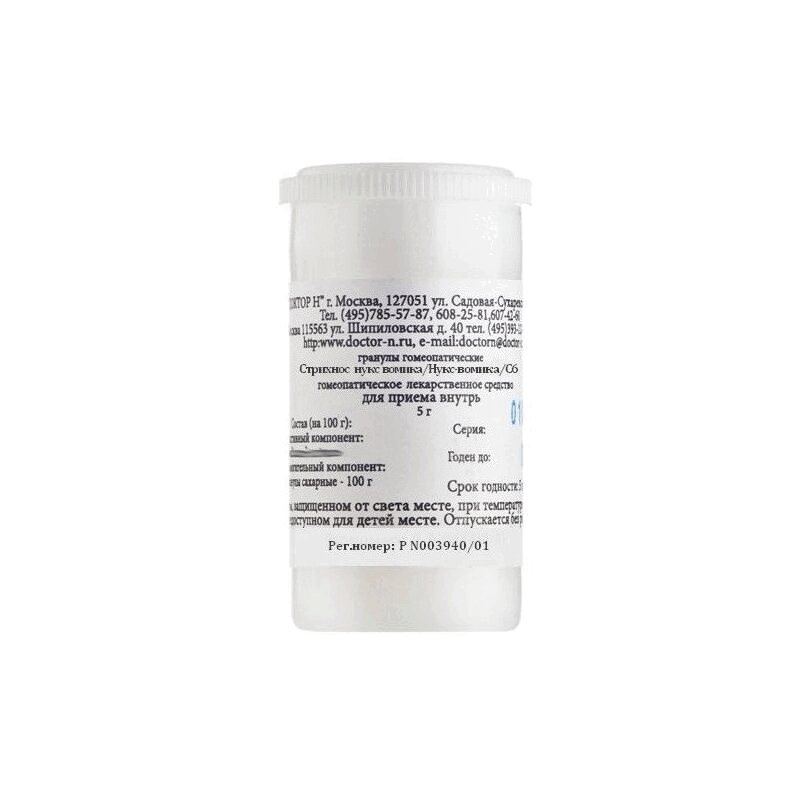 Состав (на 100 г): активный компонент: Strychnos nux-vomica (Nux vomica) Стрихнос нукс-вомика (Нукс вомика)) C6 - 1,0 г вспомогательный компонент: гранулы сахарные - 100 г