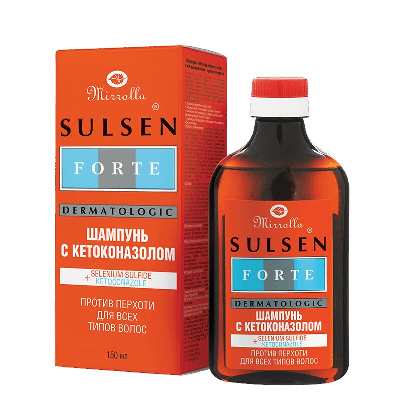 Новая оптимизированная формула шампуня «Mirrolla Sulsen Forte»® с Кетоконазолом создана на основе активных противоперхотных компонентов Selenium Sulfide и Ketoconazole. Обладает ярко выраженными иммуномоделирующим и противоперхотным действиями.