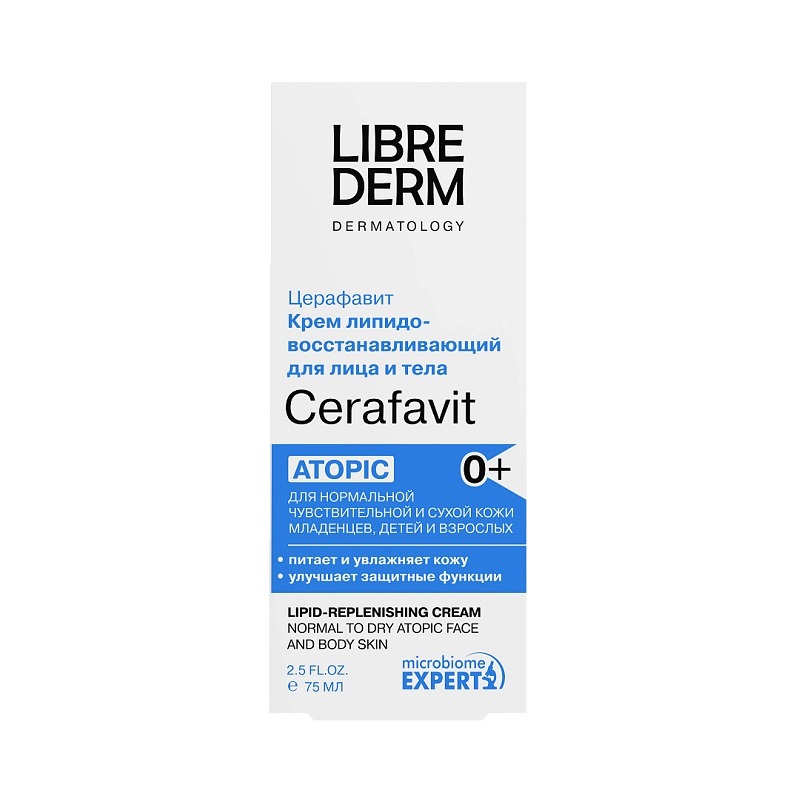 Липидовосстанавливающий крем CERAFAVIT разработан для ежедневного ухода за сухой, чувствительной и атопической кожей 0+. Специальная формула средства с ключевыми липидами здоровой кожи (витамином F, церамидами, холестеролом) и пребиотиком мгновенно устраняет сухость и ощущение стянутости, помогает уменьшить зуд и раздражения, поддерживая защитный барьер и микробиом кожи. Без красителей и парабенов. Гипоаллергенная отдушка. КЛИНИЧЕСКИ ДОКАЗАННАЯ ЭФФЕКТИВНОСТЬ И БЕЗОПАСНОСТЬ: Применение средств Cerafavit с церамидами и пребиотиком в три раза уменьшает проявления сухости, покраснения и зуда; * Более чем в два раза снижает потребность в топических гормональных средствах; * Безопасно с первых дней жизни. ** *Открытое сравнительное исследование «Изучение клинической эффективности, безопасности и переносимости косметического средства LIBREDERM «CERAFAVIT с церамидами и пребиотиком» N = 30, от 1 года до 18 лет. Период – 3 месяца. На базе Федерального государственного автономного учреждения "Национальный медицинский исследовательский центр здоровья детей" Минздрава России. Главный исследователь: Мурашкин Н.Н., д.м.н., проф