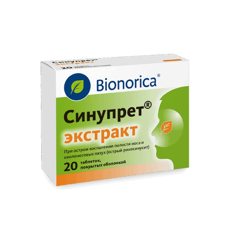 В рандомизированных двойных слепых клинических исследованиях препарат Синупрет® показал значительное уменьшение острых симптомов и признаков синусита. В двух из них препарат Синупрет® значительно превосходил плацебо после 2 недель лечения в качестве дополнения к антибактериальной терапии. Уменьшение симптомов обструкции и головной боли было более выраженным в группе, получавшей препарат Синупрет®. В двух клинических исследованиях активного контроля с амброксолом оба метода лечения показали одинаковую эффективность. Однако у пациентов в группе препарата Синупрет® наблюдалось значительное уменьшение некоторых симптомов (таких как пиорея, головная боль) по сравнению с амброксолом. В случаях хронического синусита данные общих шкал оценки пациентов свидетельствовали в пользу препарата Синупрет®.