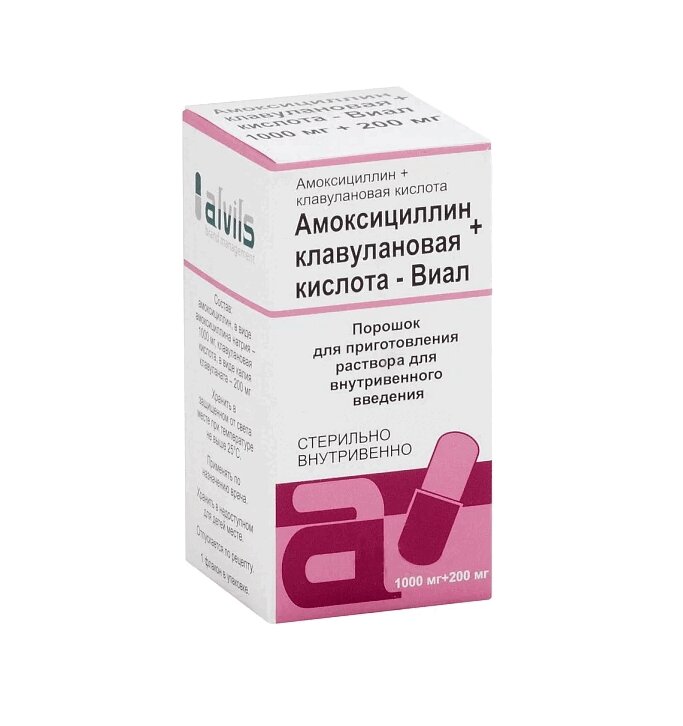 Амоксициллин+Клавулановая кислота-Виал 1000 мг+ 200 мг порошок для приготовления раствора для внутривенного введения 1 шт