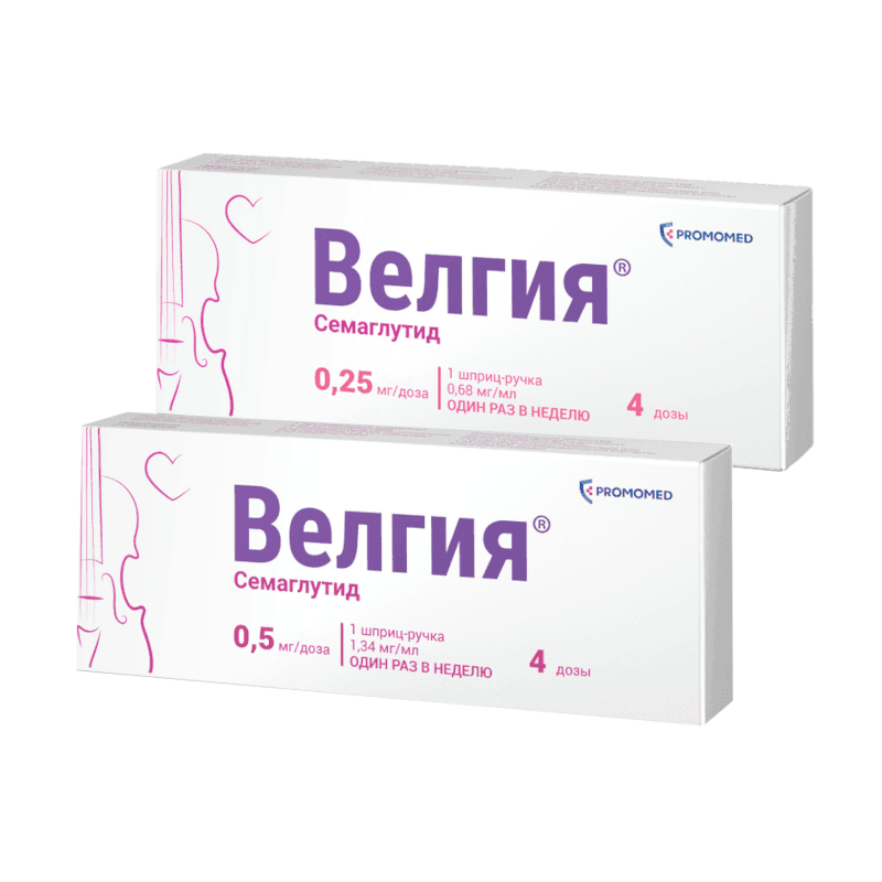 Велгия®, 0,25 мг/доза, раствор для подкожного введения В одной предварительно заполненной шприц-ручке содержится 1 мг семаглутида в 1,5 мл раствора препарата, что соответствует 4 дозам по 0,25 мг семаглутида.