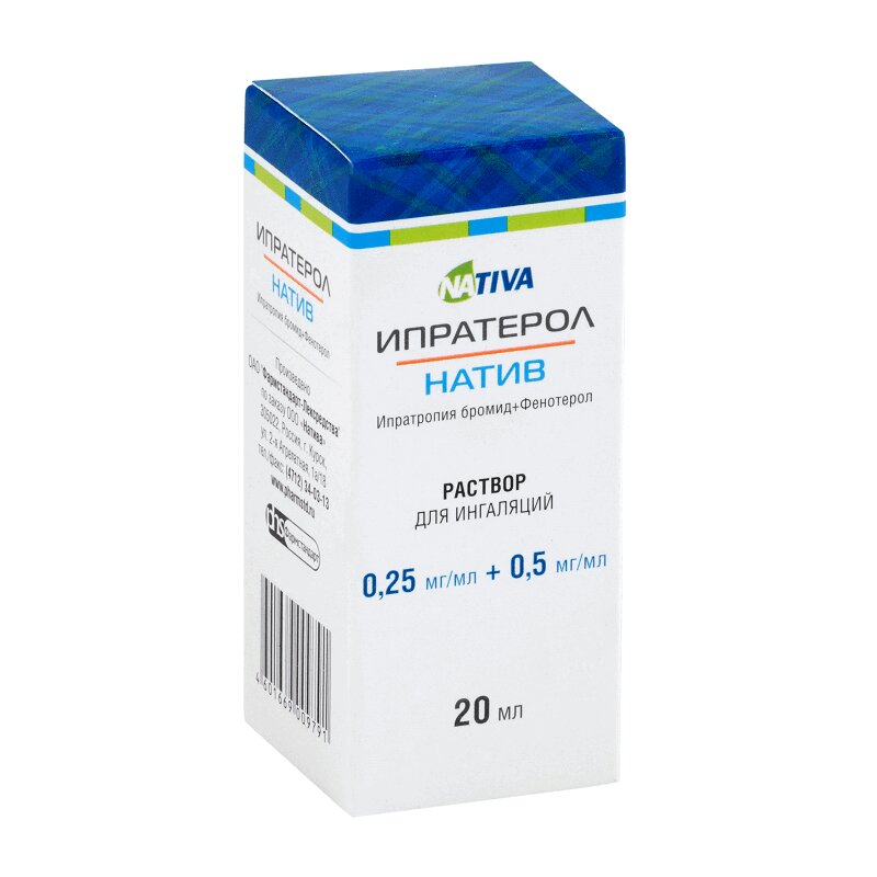Т1/2 в терминальной фазе составляет приблизительно 1.6 ч. Общий клиренс ипратропия бромида составляет 2.3 мл/мин, а почечный клиренс - 0.9 л/мин. Суммарная почечная экскреция (в течение 6 дней) меченой изотопом дозы (включая исходное соединение и все метаболиты) составляла после в/в введения 72.1%, после приема внутрь - 9.3%, а после ингаляционного применения - 3.2%. Общая меченая изотопом доза, выделявшаяся через кишечник, составляла после в/в введения 6.3%, после приема внутрь - 88.5%, а после ингаляционного применения - 69.4%. Таким образом, экскреция меченой изотопом дозы после в/в введения осуществляется, в основном, через почки. Т1/2 исходного соединения и метаболитов составляет 3.6 ч.