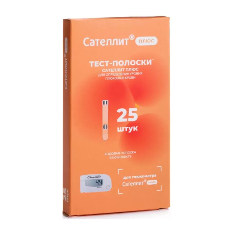 Тест-полоски «Сателлит Плюс» предназначены для определения концентрации уровня глюкозы в цельной крови человека. ВНИМАНИЕ!!! Тест-полоски «Сателлит Плюс» применяются ТОЛЬКО для Глюкометра «Сателлит Плюс»! ХАРАКТЕРИСТИКИ Полоски в индивидуальной упаковке, на которой написан срок годности и код полоски. Объем крови - 4-5 мкл Время измерения 20 секунд. Требуется точность в нанесении капли крови на полоски. • Диапазон измерений от 0,6 до 35,0 ммоль/л • Принцип измерения электрохимический • Калибровка измерений по цельной капиллярной крови • Температура хранения от -20 °С до +30 °С • Температура эксплуатации от +18 °С до +35 °С • Срок годности 24 мес. Каждая тест-полоска предназначена только для однократного применения. Не используйте их повторно. Особые условия Не используйте тест-полоски после истечения срока годности, указанного на упаковке. Не сгибайте, не разрезайте и не деформируйте тест-полоски. Тест-полоски для Глюкометра «Сателлит Плюс» - 50 штук в индивидуальной упаковке. Кодовая полоска в комплекте.