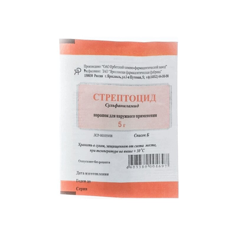Стрептоцид - противомикробное бактериостатическое средство, сульфаниламид.Механизм действия обусловлен конкурентным антагонизмом с парааминобензойной кислотой (ПАНК), угнетением дигидроптероатсинтазы, нарушением синтеза тетрагидрофолиевой кислоты, необходимой для синтеза пуринов и пиримидипов.Активен в отношении грамположительных и грамотрицательных кокков, Escherichia coli. Shigella spp., Vibrio cholerae, Clostridium perfringens, Bacillus anthracis, Corynebacterium diphtheriae, Yersinia pestis. Chlamydia spp., Actinomyces israelii. Toxoplasma gondii.При нанесении на кожу способствует быстрому заживлению ран и эпителизации эрозий.