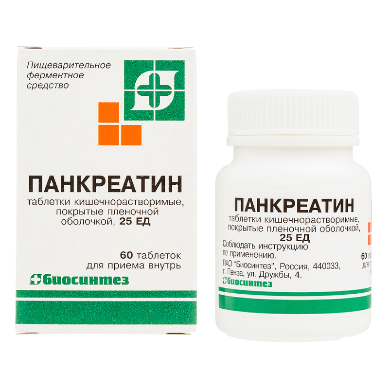 Панкреатин 25 ЕД таблетки кишечнорастворимые покрытые пленочной оболочкой флакон 60 шт Биосинтез