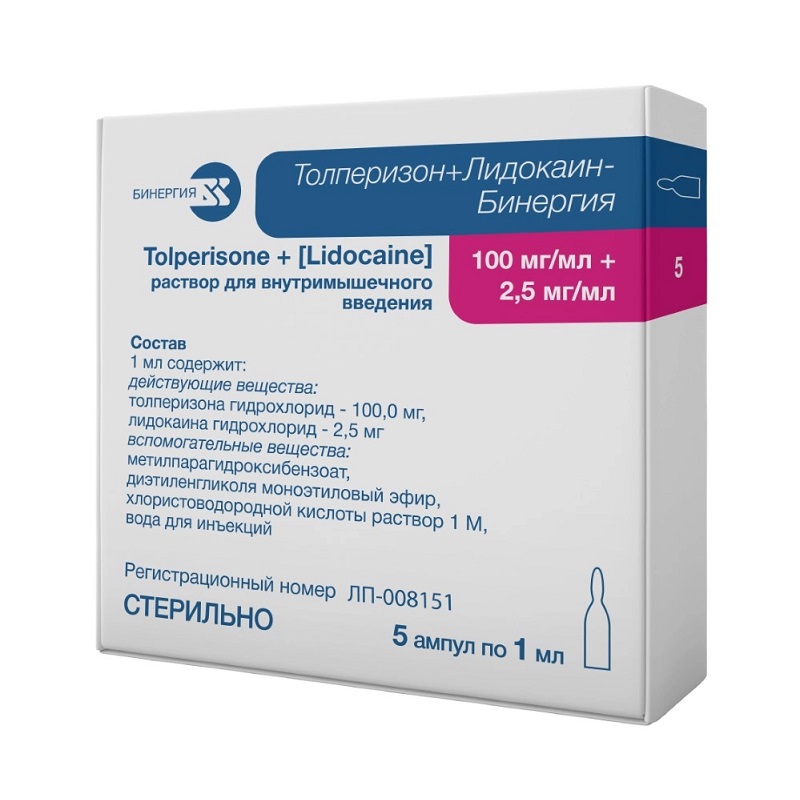 Инструкция по применению Толперизон+Лидокаин-Бинергия 100 мг/мл+2,5 мг/мл раствор для инъекций 1 мл 5 шт