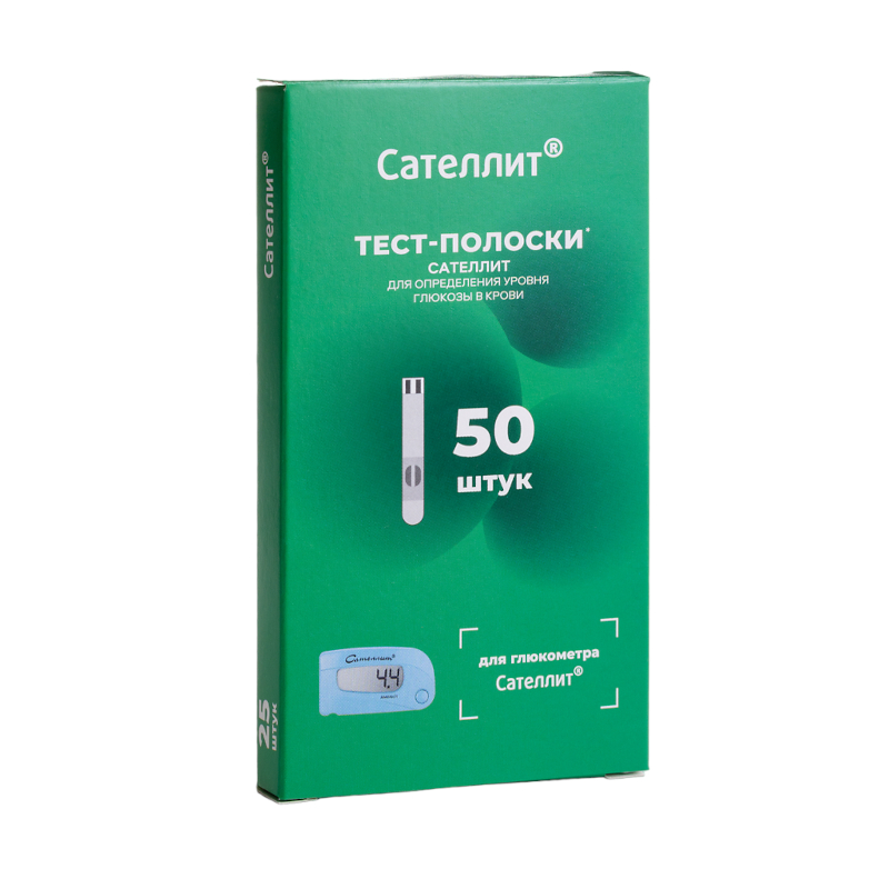 Тест-полоски «Сателлит» предназначены для определения концентрации уровня глюкозы в цельной крови человека. ВНИМАНИЕ!!! Тест-полоски «Сателлит» применяются ТОЛЬКО для Глюкометра «Сателлит»! ХАРАКТЕРИСТИКИ Полоски в индивидуальной упаковке, на которой написан срок годности и код полоски. Объем крови - 4-5 мкл Время измерения 40 секунд. Требуется точность в нанесении капли крови на полоски. • Диапазон измерений от 1,8 до 35,0 ммоль/л • Принцип измерения электрохимический • Калибровка измерений по цельной капиллярной крови • Температура хранения от -20 °С до +30 °С • Температура эксплуатации от +18 °С до +30 °С • Срок годности 24 мес. Каждая тест-полоска предназначена только для однократного применения. Не используйте их повторно. Особые условия Не используйте тест-полоски после истечения срока годности, указанного на упаковке. Не сгибайте, не разрезайте и не деформируйте тест-полоски.