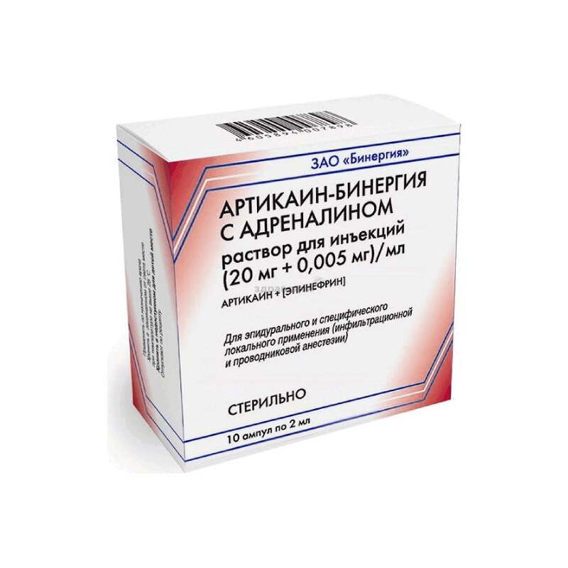 Артикаин-Бинергия с адреналином является комбинированным препаратом, в состав которого входит артикаин (местноанестезирующее средство амидного типа) и эпинефрин (сосудосуживающее средство), который добавляют в состав препарата для пролонгации анестезии.