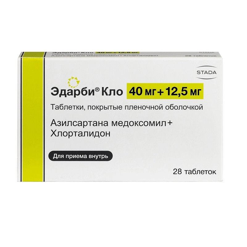 Комбинированный антигипертензивный препарат. В состав препарата Эдарби® Кло входят антагонист рецепторов ангиотензина II (азилсартана медоксомил) и тиазидоподобный диуретик (хлорталидон). Одновременное применение двух действующих веществ приводит к более выраженному снижению АД по сравнению с приемом каждого из них в монотерапии. При приеме препарата 1 раз/сут достигается эффективное снижение АД в течение 24 ч.