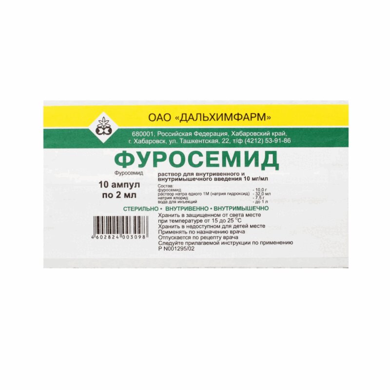 Фуросемид 10 мг/мл раствор для внутривенного и внутримышечного введения ампула ампула 2 мл 10 шт Дальхимфарм