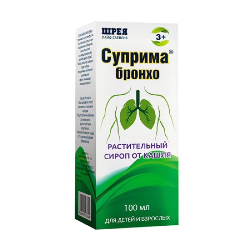 Режим дозирования Взрослым и детям старше 14 лет препарат назначают по 1-2 чайные ложки (5-10 мл) 3 раза/сут. Детям от 6 до 14 лет - по 1/2-1 чайной ложке (2.5-5 мл) 3 раза/сут; от 3 лет до 5 лет - по 1/2 чайной ложке (2.5 мл) 3 раза/сут. Курс лечения составляет 2-3 недели. Передозировка До настоящего времени о случаях передозировки препарата Суприма-Бронхо не сообщалось. Противопоказания к применению повышенная чувствительность к компонентам препарата. Применение у детей Детям от 6 до 14 лет - по 1/2-1 чайной ложке (2.5-5 мл) 3 раза/сут; от 3 лет до 5 лет - по 1/2 чайной ложке (2.5 мл) 3 раза/сут. Ограничения для детей Применяется с осторожностью Ограничения для пожилых пациентов Нет данных Ограничения при нарушениях функции печени Нет данных Применение при беременности и кормлении грудью Применение препарата при беременности возможно только в случаях, когда предполагаемая польза для матери превышает потенциальный риск для плода или ребенка. Ограничения при беременности Применяется с осторожностью Ограничения при кормлении грудью Применяется с осторожностью Ограничения при нарушениях функции почек Нет данных