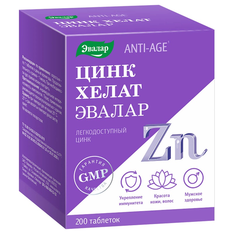 Цинк хелат Эвалар способствует:- Повышению сопротивляемости организма к инфекциям (укреплению иммунитета);- Предотвращению выпадения волос;- Синтезу собственного коллагена;- Антиоксидантной защите (Anti-Age эффекту);- Усилению выработки инсулина;- Синтезу тестостерона;- Позволяет регулировать деятельность сальных желез, справляться с жирным блеском кожи и покраснениями;- Участвует в процессе сперматогенеза.Преимущества Цинк хелат «Эвалар»:- Удобный прием – всего 1 таблетка в день;- Не вызывает побочных эффектов со стороны ЖКТ;- Экономичная упаковка;- Выгодная цена1;- Сырье высокого качества;- Разрешен беременным и кормящим женщинам; - Произведен по международному стандарту качества GMP2.