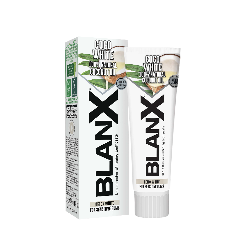 Паста прекрасно подойдем вам, если вы любите кофе, чай и сигареты - она эффективно устраняет налёт и пятна на эмали. В состав пасты входит неабразивная силика высокого качества, которая мягко и деликатно очищает налет с поверхности эмали. Паста низкоабразивна, поэтому очищает эмаль бережно, не царапая и не истончая ее. А монофторфосфат натрия и ксилит будут помогать в борьбе с кариесом и укреплять эмаль. Древесный уголь, входящий в состав пасты, оказывает абсорбирующее действие, избавляя от неприятного запаха изо рта. Частицы древесного угля прикрепляются к пигментным пятнам и мягко очищают эмаль, делая улыбку белоснежнее. Уникальный компонент пасты - экстракт арктического лишайника, который входит в состав полирующих микрогранул. Усниновая кислота, получаемая из экстракта, и папаин в составе пасты мягко расщепляют красящие пигменты на эмали и дентине, восстанавливая естественную белизну. Экстракт арктического лишайника оказывает эффективное антибактериальное действие, защищая от бактерий и кариеса. Паста содержит монофторфосфат натрия (1450 ppm) и ксилит, которые обеспечивают профилактику кариеса. Преимущества пасты Blanx Black: Регулярное применение снижает образование налета Удаляет потемнения эмали от табака, кофе, вина Устраняет неприятный запах изо рта Благодаря низкой абразивности подходит для ежедневного применения
