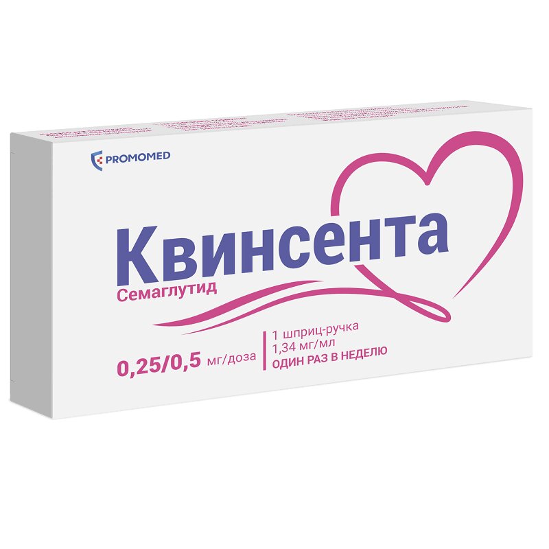 ** Для шприц-ручки Квинсента® 0.25/0.5/1 мг/доза: в одной предварительно заполненной шприц-ручке содержится 4 мг семаглутида/3 мл раствора лекарственного препарата.