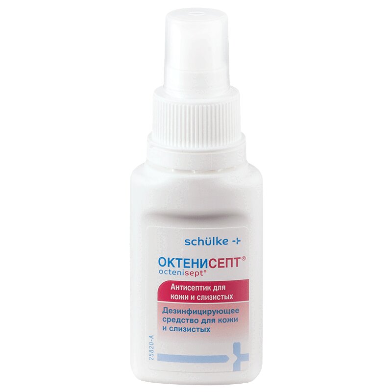 Обработку производят поочередно двумя тампонами, обильно смоченными Октенисептом. Пораженная поверхность должна быть обработана полностью. На легкодоступные участки препарат можно наносить путем распыления. Время экспозиции — не менее 1–2 мин.