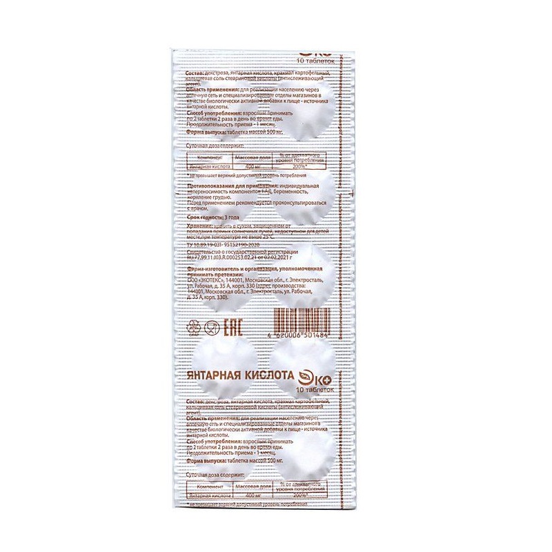 Инструкция по применению Эркафарм Янтарная кислота Иммуно таблетки 10 шт