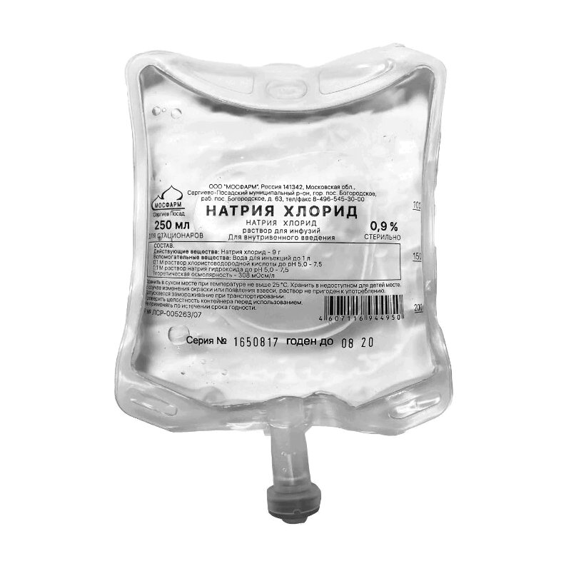 Натрия хлорид 0,9% раствор для инфузий контейнер полимерный 250 мл 1 шт Мосфарм