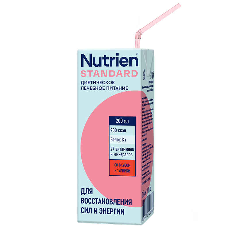 Nutridrink - cбалансированный источник белка, энергии и необходимых нутриентов, помогает восстановить силы после болезни. Продукт предназначен для взрослых пациентов с недостаточностью питания или риском ее развития, возникающими при инсульте, травмах, инфекциях, хронической обструктивной болезни легких, хронических заболеваниях системы пищеварения, в пред- и послеоперационный период Высококалорийный продукт содержит натуральные каротиноиды, витамины группы B, С, Е , D3 , К, фолиевую и пантотеновую кислоты, микроэлементы (хром, селен, медь) и минеральные вещества (натрий, калий, кальций, фосфор, магний, железо, цинк, марганец). В линейке представлено 3 вкуса для разнообразия рациона: ваниль, клубника, банан. Может употребляться в качестве дополнительного или единственного источника питания. Клинически значимый эффект наступает при приеме не менее чем в течение 14 дней. Длительность приема не ограничена (1–3 бутылочки в день как дополнение к диете, 5–7 бутылочек в день как единственный источник питания, если иное не назначено врачом). Только для энтерального питания. Не использовать парентерально. Возраст: С 18 лет Показания к применению: