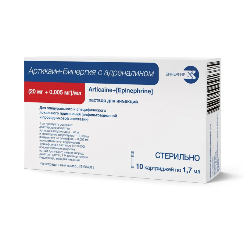 Артикаин-Бинергия с адреналином 20 мг+0,005 мг/мл раствор для инъекций картридж 1,7 мл 10 шт