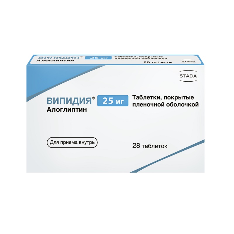 Рекомендуемая доза препарата Випидия® составляет 25 мг 1 раз/сут в качестве монотерапии или в дополнение к метформину, тиазолидиндиону, производным сульфонилмочевины или инсулину, или в качестве трехкомпонентной комбинации с метформином, тиазолидиндионом или инсулином.