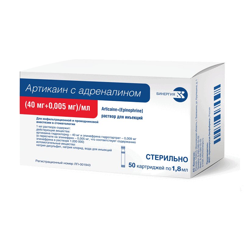Артикаин с адреналином 40 мг+0,005 мг/мл раствор для инъекций картридж 1,8 мл 50 шт