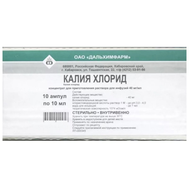 Калия хлорид 40 мг/мл концентрат для приготовления раствора для инфузий ампула 10 мл 10 шт Дальхимфарм