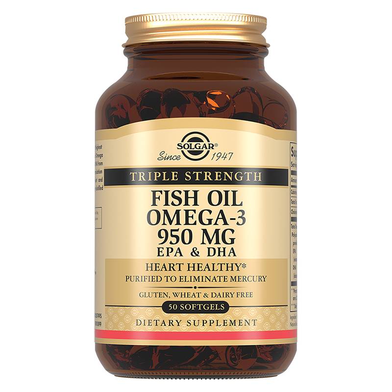 Полиненасыщенные жирные кислоты омега-3 относятся к группе эссенциальных жиров, так как участвуют в формировании мембран клеток головного мозга, зрительного анализатора и биологических мембран других органов и тканей. Поскольку организм человека их не синтезирует самостоятельно, они должны поступать с пищей. Для получения «Тройная Омега-3 950 ЭПК и ДГК» используется рыбий жир, богатый содержанием ПНЖК Омега-3, полученный из глубоководных рыб холодных морей (анчоус, макрель, сардины, сельдь). Из всех продуктов Солгар, содержащих жирные кислоты класса Омега-3, «Тройная Омега-3 950 ЭПК и ДГК» содержит самую высокую дозировку Омега-3 ПНЖК - 950 мг в одной капсуле. «Тройная Омега-3 950 мг ЭПГ и ДГК» производится по уникальной технологии молекулярной дистилляции - методу, который позволяет удалить соли тяжелых металлов из рыбьего жира. Для защиты от прогоркания и окисления в каждую капсулу «Тройная Омега-3 950 мг ЭПГ и ДГК» добавлен натуральный витамин Е.