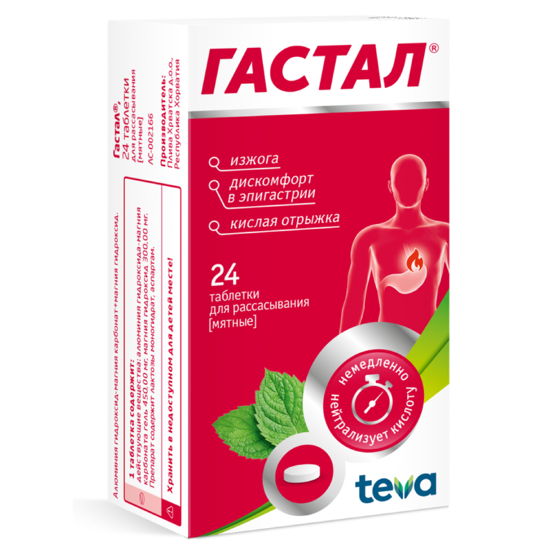 Гастал - комбинированный антацидный препарат для приема внутрь. Снижает повышенную кислотность желудочного сока до физиологического уровня и устраняет диспепсические расстройства за счет нейтрализации избытка соляной кислоты в желудке. Входящие в состав Гастала гидроксид магния и гидроксид алюминия обеспечивают быструю и длительную нейтрализацию, обусловливающую антацидный эффект.
