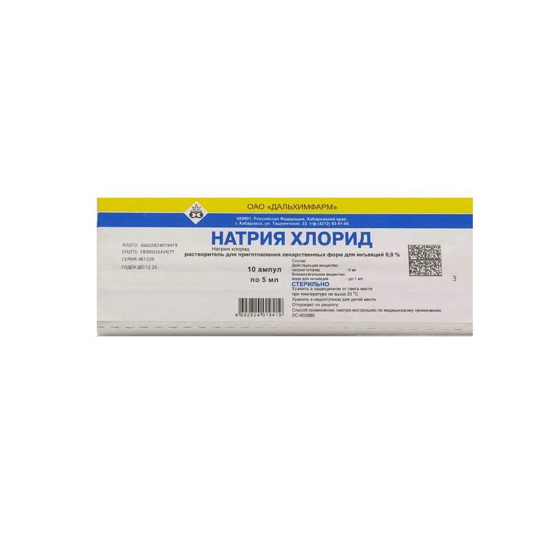 Натрия хлорид 0,9% растворитель для приготовления лекарственных форм для инъекций 5 мл 10 шт Дальхимфарм