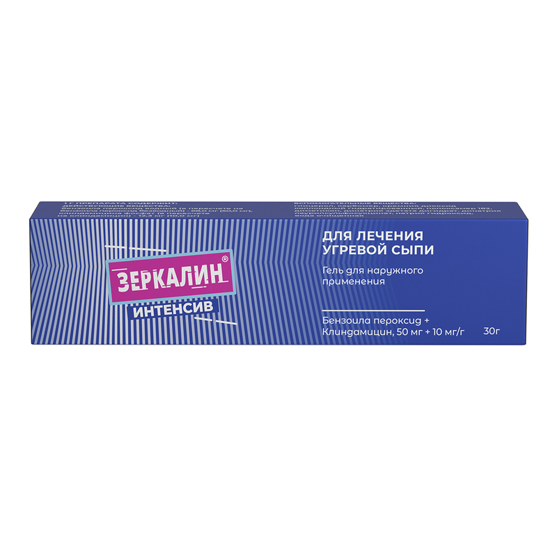 Зеркалин Интенсив - комбинированный препарат клиндамицина и бензоила пероксида для лечения акне легкой и умеренной степени тяжести, особенно с преобладанием воспалительных элементов сыпи. Клиндамицин останавливает размножение бактерий, приводящих к воспалению при акне, оказывает противовоспалительное действие и способствует снижению комедонов. Бензоила пероксид облегчает удаление излишка ороговевших клеток кожи, способных приводить к закупорке пор, а также вызывает гибель бактерий и препятствует появлению устойчивых к клиндамицину микроорганизмов.