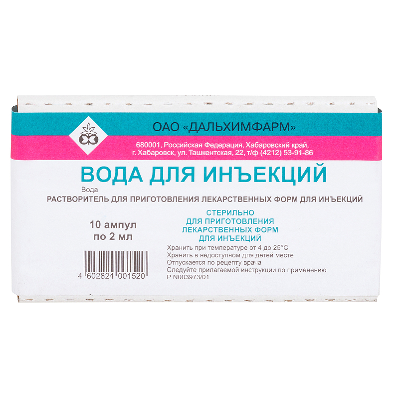 Показания Растворение и разведение лекарственных препаратов для их парентерального (инъекционного/инфузионного) введения непосредственно перед применением. Применяется с целью приготовления стерильных инфузионных и инъекционных растворов из порошков, лиофилизатов и концентратов. Фармакологическое действие Вода для инъекций не обладает фармакологической активностью. Используется в качестве растворителя, предназначена для приготовления инфузионных и инъекционных растворов, обеспечивая оптимальные условия для совместимости и эффективности субстратов и воды. Вода является основой различных трансфузионных препаратов, биологических тканей и жидкостей (кровь, лимфа, плазма клеток и др.), необходима для обменных процессов. В нормальных условиях вода выделяется с мочой, с калом, с потом и при дыхании. Потеря жидкости с потом, при дыхании и с каловыми массами происходит независимо от введения жидкости. Поддержание адекватной гидратации требует 30-45 мл/кг/сут воды у взрослых; у детей - 45-100 мл/кг, а у грудных детей - 100-165 мл/кг. Лекарственное взаимодействие При смешивании с другими лекарственными препаратами (инфузионные растворы, концентраты для приготовления инфузионных растворов, инъекционные растворы, порошки, сухие вещества для приготовления инъекционных растворов) необходим визуальный контроль на совместимость (может иметь место фармацевтическая несовместимость).