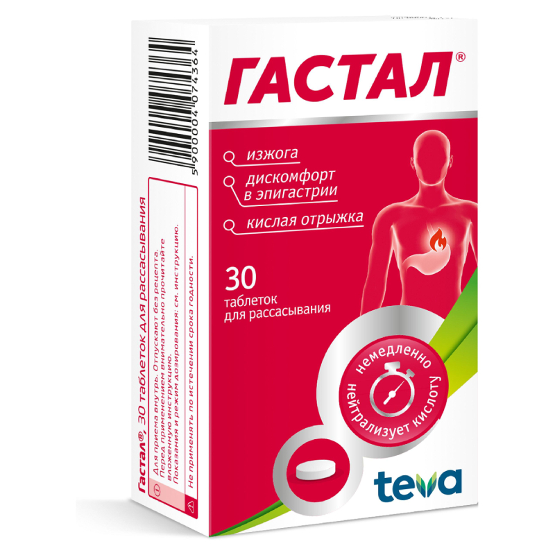 Алюминия гидроксида-магния карбоната гель и магния гидроксид обеспечивают немедленную (сразу же после приема) и продолжительную (около 2 ч) нейтрализацию соляной кислоты желудочного сока, с поддержанием кислотности в желудке на физиологическом уровне (pH 3-5). 1 таблетка препарата Гастал® нейтрализует около 21.5 ммоль соляной кислоты.