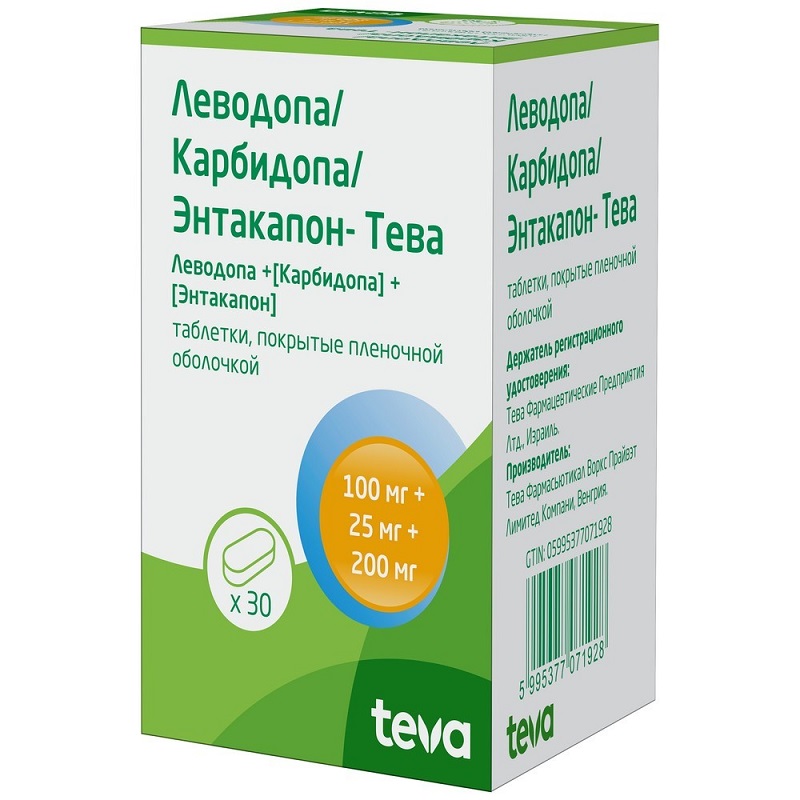 Инструкция по применению Леводопа/Карбидопа/Энтакапон-Тева 100 мг+25 мг+200 мг таблетки 30 шт